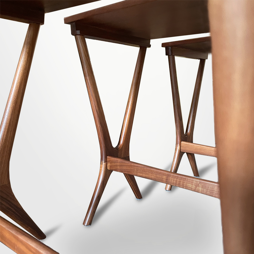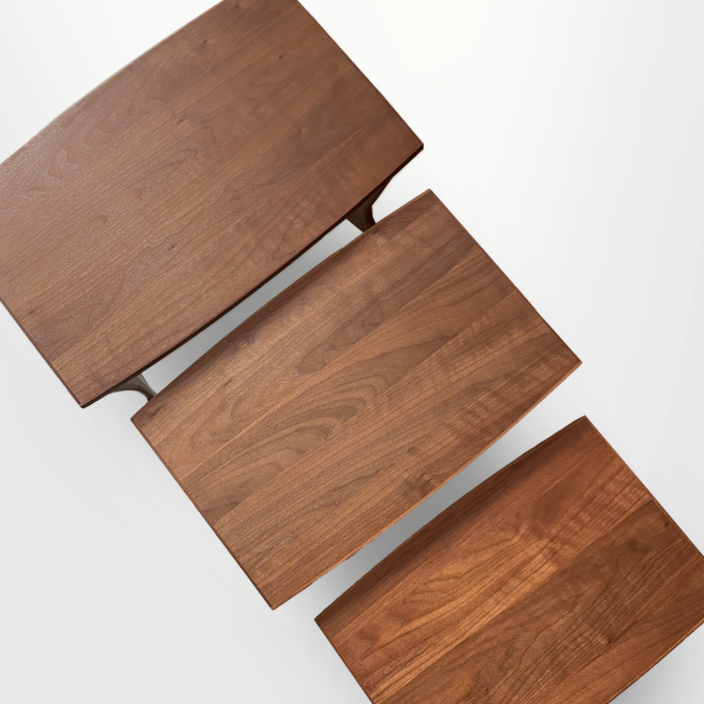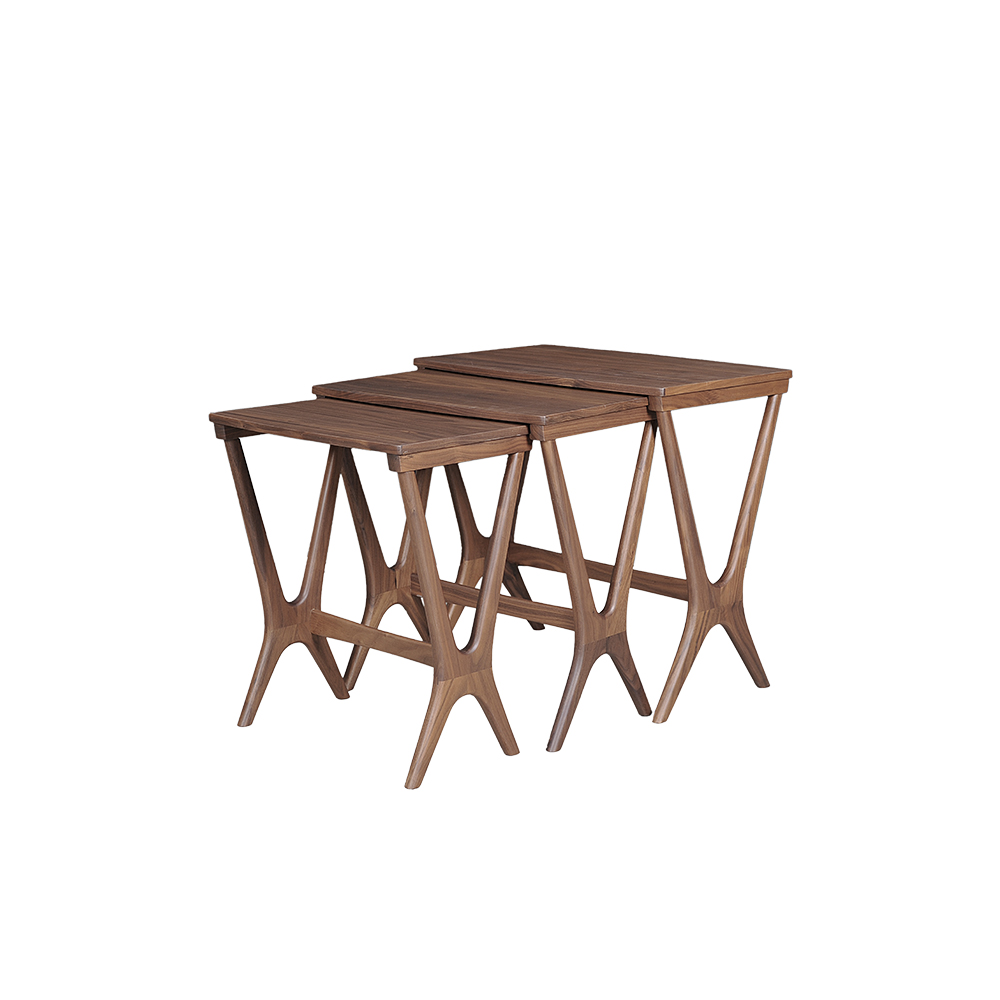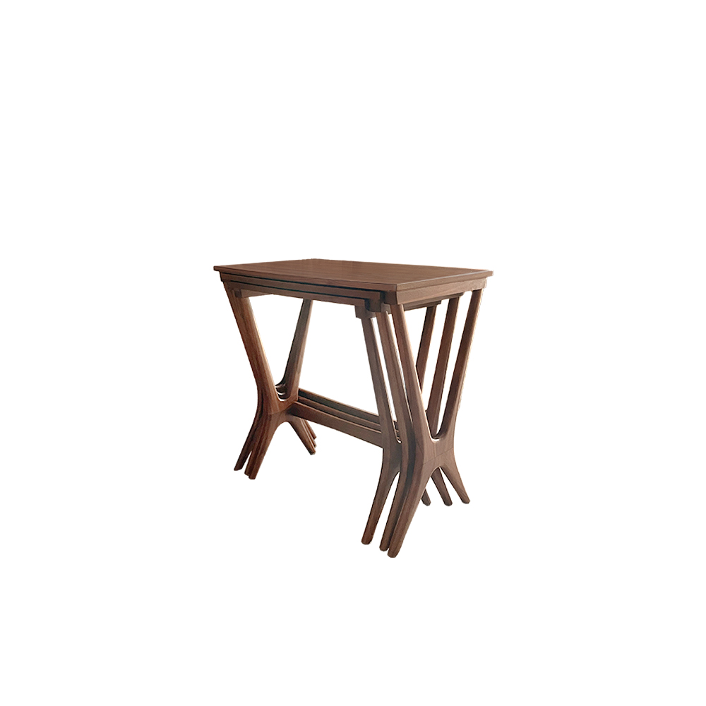 以北美胡桃木製作的三件式巢几,展現中世紀之美纖細的桌腳交錯成幾何節奏,兼具穩定與輕盈感。