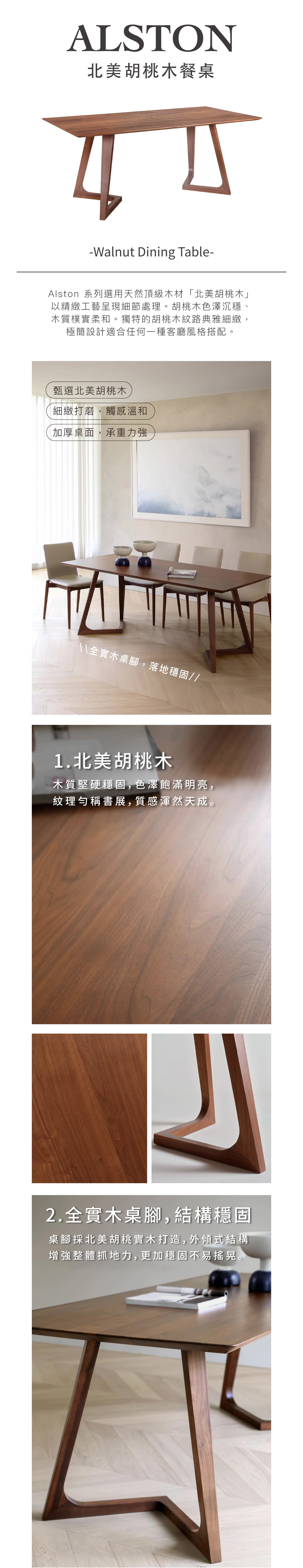 Alston系列選用天然頂級木材 「北美胡桃木」,以精緻工藝呈現細節處理。胡桃木色澤低調沉穩、木質樸實柔和。獨特的原木紋理典雅細緻,極簡設計適合任何一種客廳風格搭配。