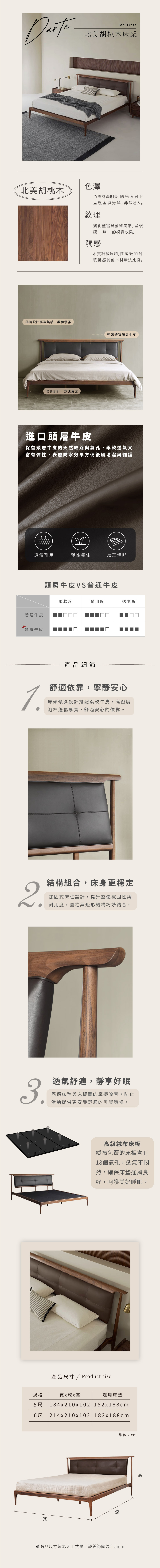 進口FAS級胡桃實木,木質堅硬與穩固,展現出豐富的木紋與色澤,為床注入自然的美感。