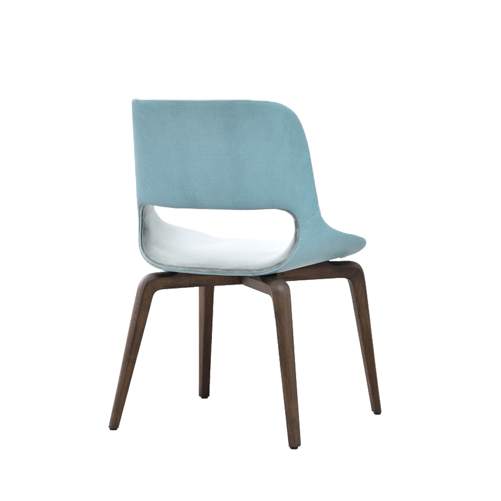 以霧藍色絨布包覆椅身,色調內斂而高雅,為空間注入一份清新與安定感,呈現出木質家具的柔和氛圍。