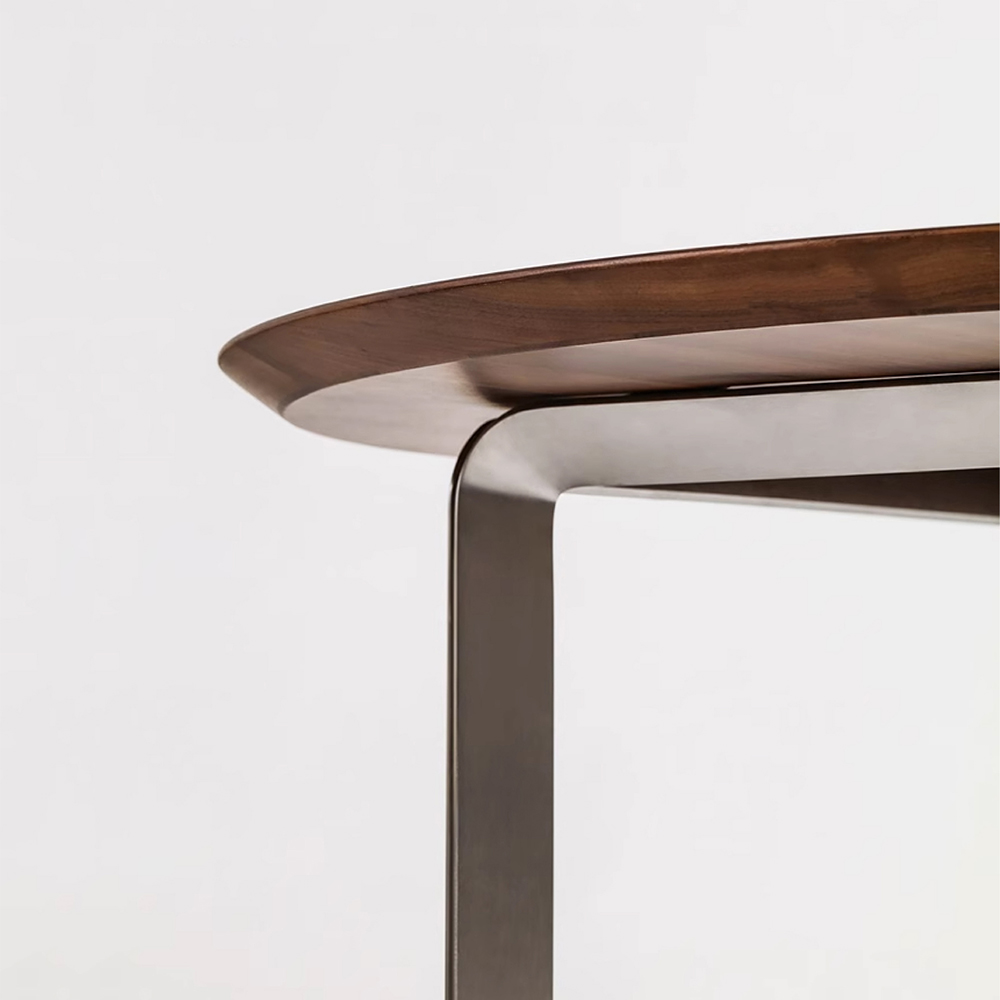 流暢的圓形桌面搭配義式現代設計,不鏽鋼的金屬質感與北美胡桃木的溫潤相互襯托,呈現冷暖交融的獨特美感。無論擺放於書房或客廳,都能自然融入空間,提升整體格調,展現細膩設計美學。